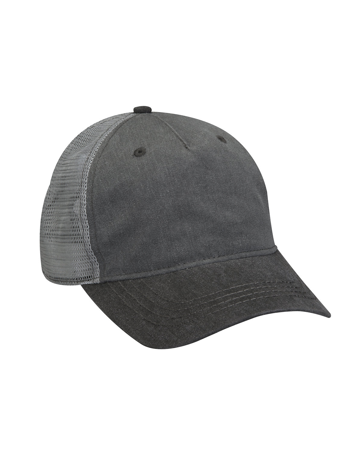 100% cotton twill pigment dye, garment washed front panels; Mesh back panels; Charcoal grey front panels & visor with light grey mesh back panels; Contrast color visor with matching sewn eyelets on the front panel and top button; 5-Panel; Unstructured low