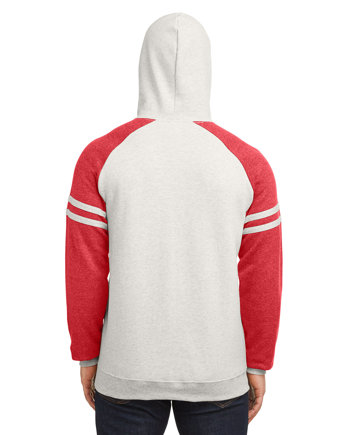 50% cotton, 50% polyester Nublend pre-shrunk fleece; High stitch density for a smooth printing canvas; Made with sustainably-sourced, USA-grown cotton; Jersey-lined hood; No drawcord in the hood; Contrast raglan sleeves; Athletic inspired varsity stripes